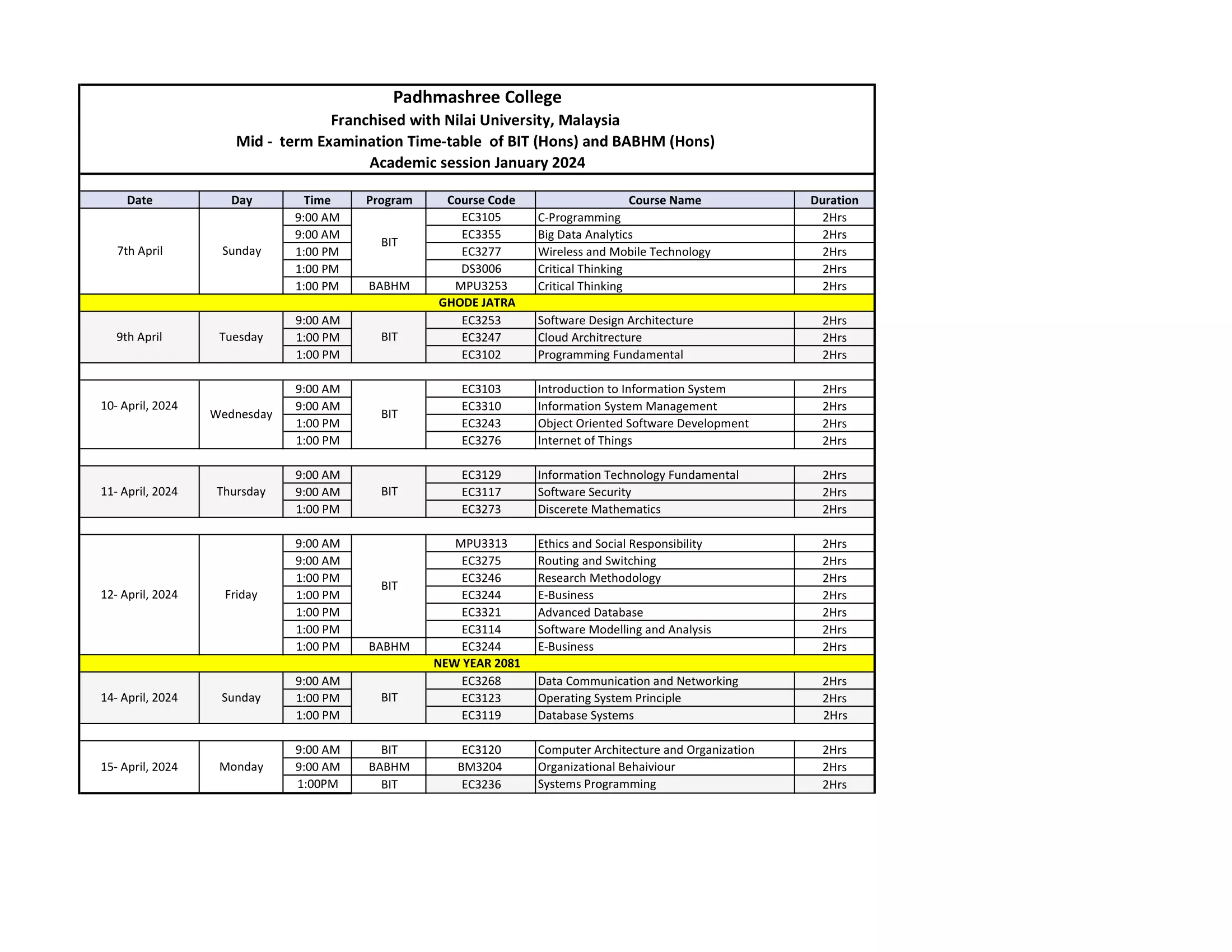 • MID TERM ROUTINE OF BIT AND BABHM DISCIPLINE ACADEMIC SESSION JAN2024